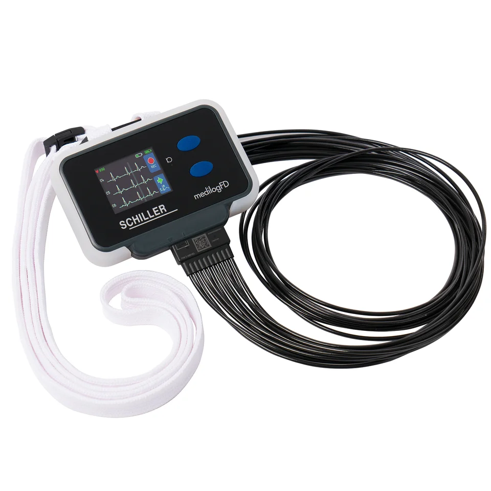 The 12-lead Holter ECG is preferred for detailed and spatial heart analysis. Regional assessment of myocardial ischemia: distinguish anterior, septal, lateral, inferior region in the dynamic setting of everyday life. medilogFD identifies the origin of ectopic beats, whether they are from the left or right ventricle. This SCHILLER Holter is superior in identifying abnormal heartbeats that start in the right or left atrium.